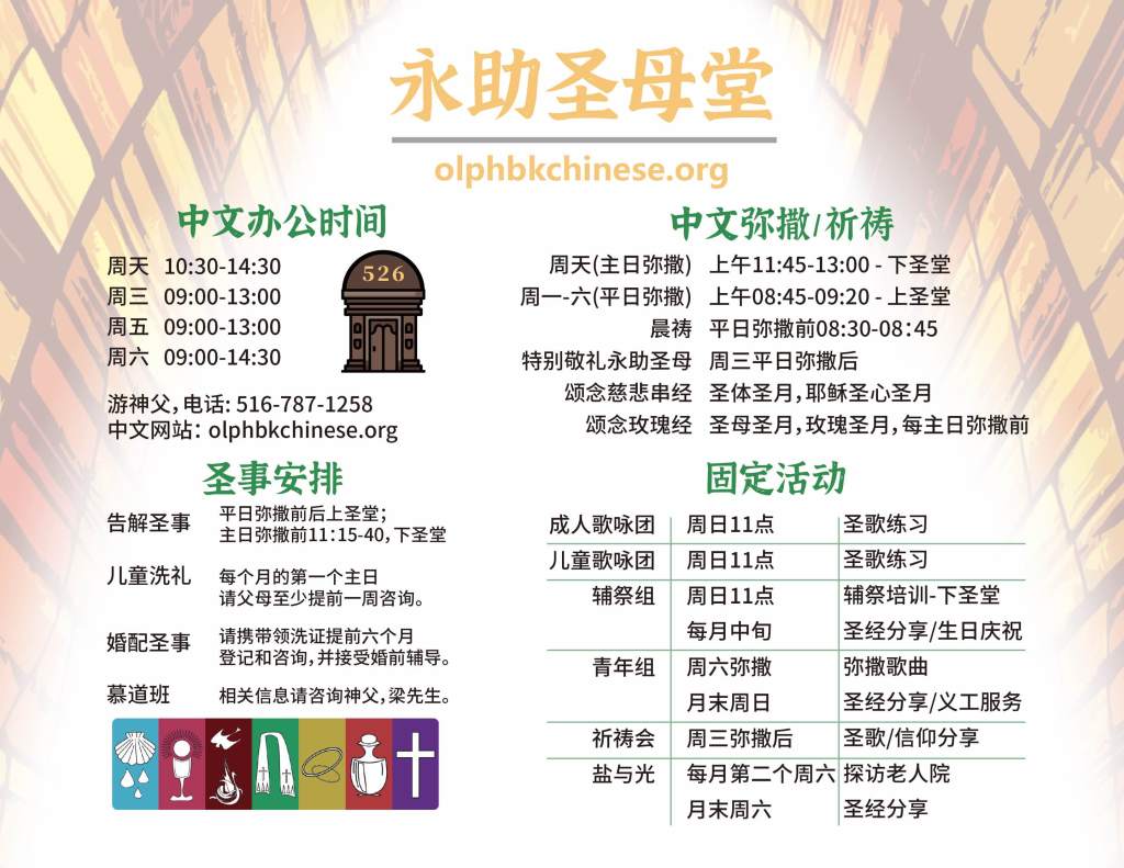 - 永助圣母庆典和游行(6月23日):永助圣母是我们堂区的主保,也是赎主会的主保。1865年,教宗庇护九世将永助圣母像,交给了当时修会的总会长,命他把圣母像供在圣亚丰索圣堂内,并吩咐道:“要使全世界都认识永助圣母。”如今,教宗的愿望实现了,世界各个角落也都有了永助圣母的敬礼!堂区将于6月23日的主日弥撒中庆祝永助圣母瞻礼弥撒和游行!游行结束后,在停车场有食物分享!永助圣母为我等祈!